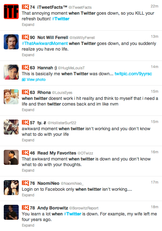 Cut to an hour later, and I find out Twitter was down for everyone. There was even a trending topic on Twitter about what happens when Twitter goes down. So, here’s what people had to say about the whole debacle. Enjoy.
